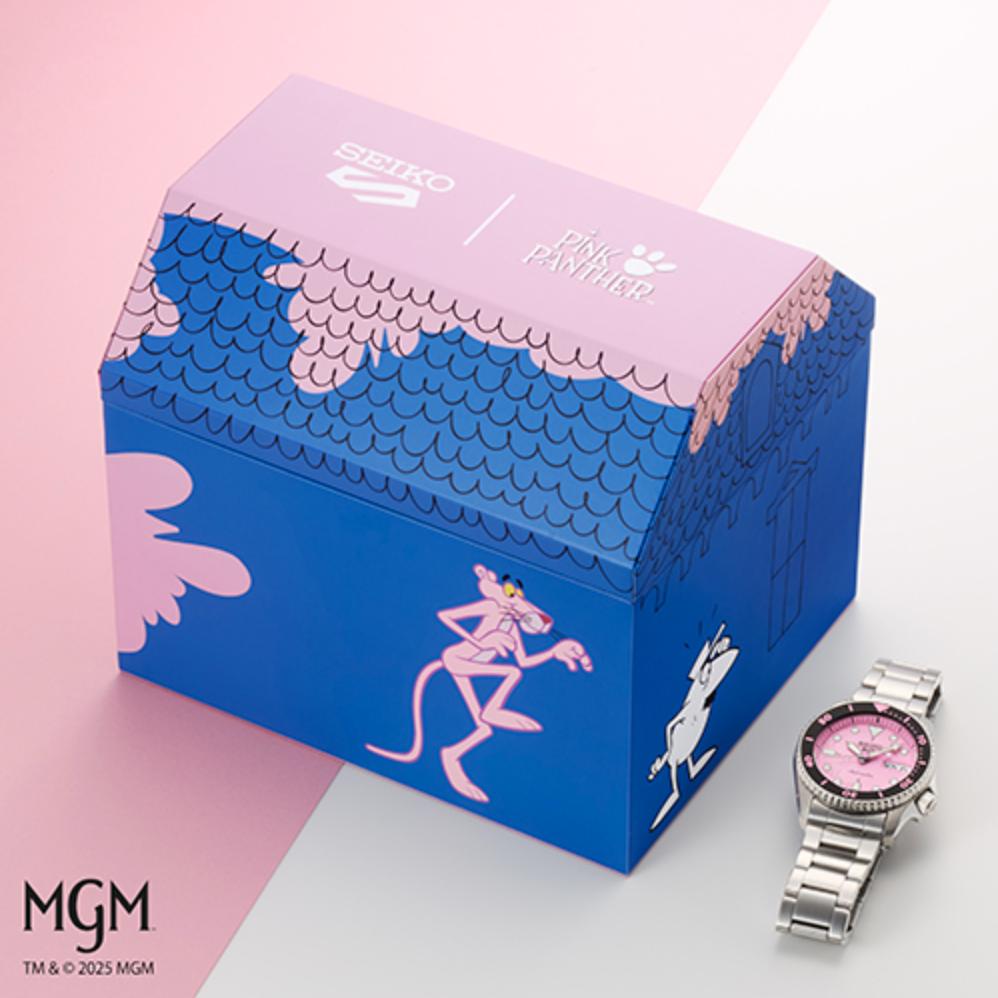 Basado en el diseño compacto de la serie SKX de 38 mm, este modelo presenta un tamaño equilibrado que se adapta cómodamente a la muñeca. Su estética está claramente inspirada en el universo Pink Panther, con una presencia dominante del color rosa y detalles gráficos que aportan un toque divertido y original sin perder la esencia relojera de la marca.