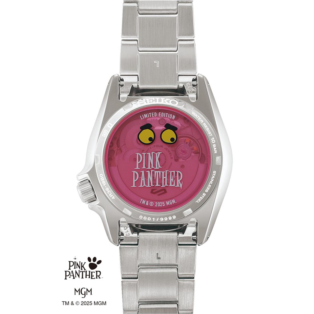 En su interior alberga el calibre automático Seiko 4R36, un movimiento de fabricación propia, fiable y probado, con función de parada de segundero, remonte manual y una reserva de marcha aproximada de 41 horas. El fondo transparente tintado en rosa permite apreciar el movimiento y muestra el logotipo oficial de Pink Panther, reforzando su carácter de edición especial.