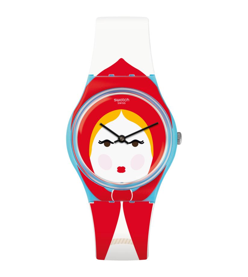 Uno de los aspectos más distintivos de este modelo es su esfera ilustrada, que incorpora elementos gráficos inspirados en el universo del cuento de Caperucita Roja. Los detalles continúan a lo largo de la caja y la correa, creando un diseño visual dinámico y divertido que convierte el reloj en un accesorio diferente y con identidad propia. Gracias a su combinación de colores y formas, este Swatch destaca fácilmente como una pieza original dentro de cualquier colección.
